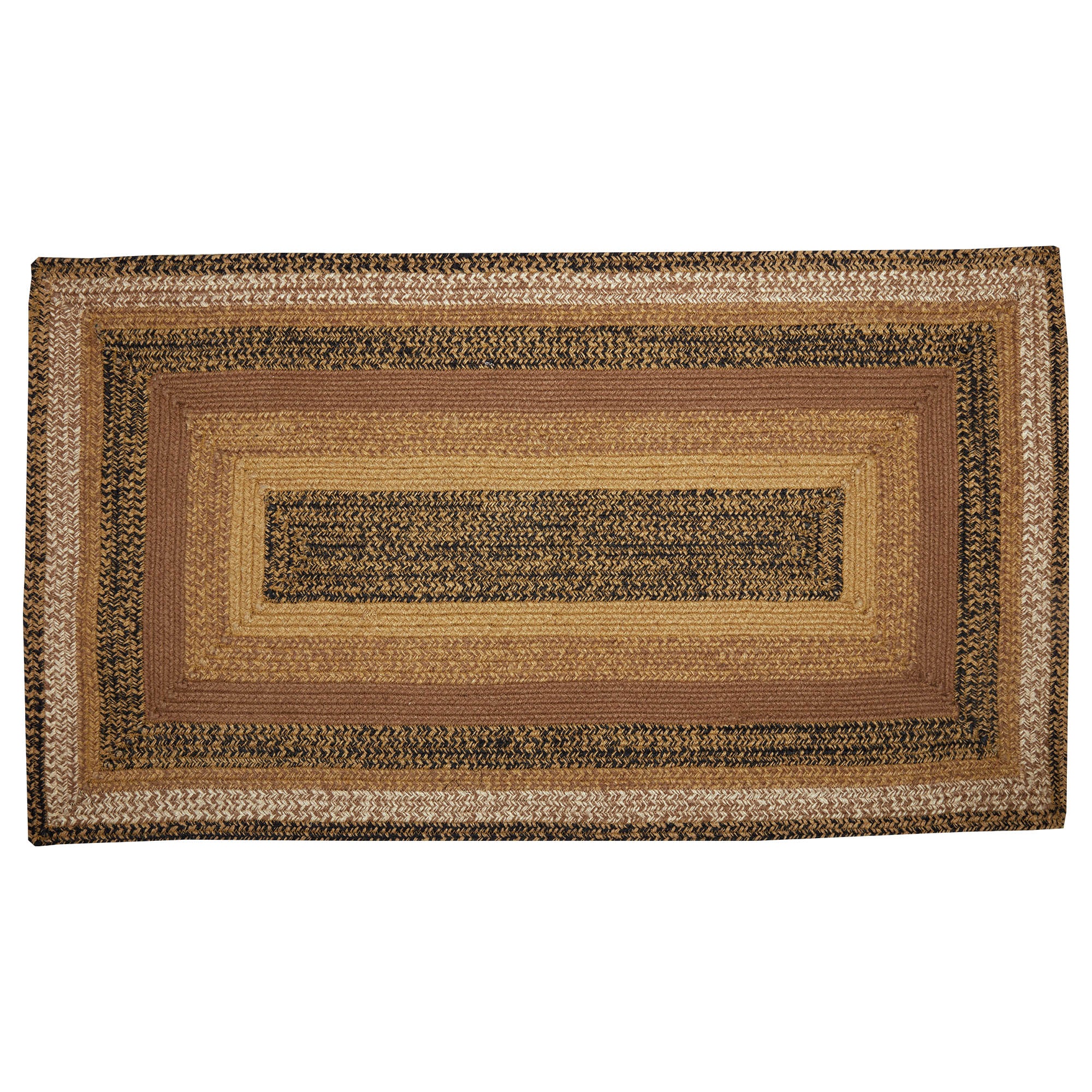 Size GuideCreate a warm, homey feeling with deep primitive colors in a curl-resistant jute blend that adds style and safety anywhere a mid-size accent rug is needed. The Kettle Grove Jute Rug measures 27x48 inches and features a classic rectangle shape and tight braids constructed with a durable jute blend. The special blend relaxes faster and stays flat. The included PVC mat makes sure your beautifully braided jute rug stays exactly where it should. Features a blend of warm caramel, country black and dark creme for a natural, rustic look that complements a wide array of country farmhouse decor.