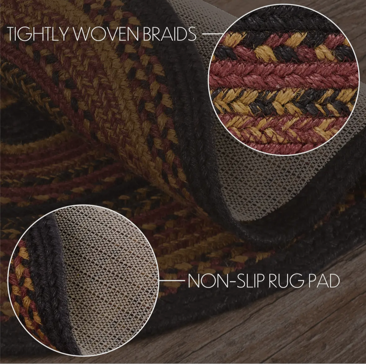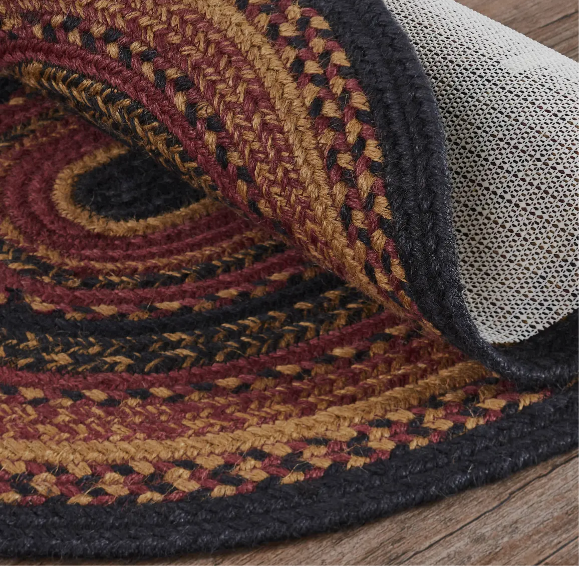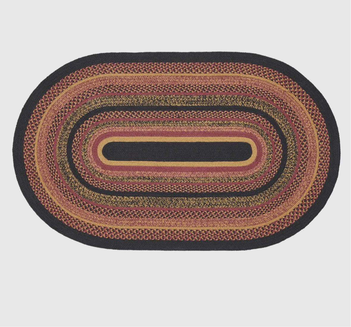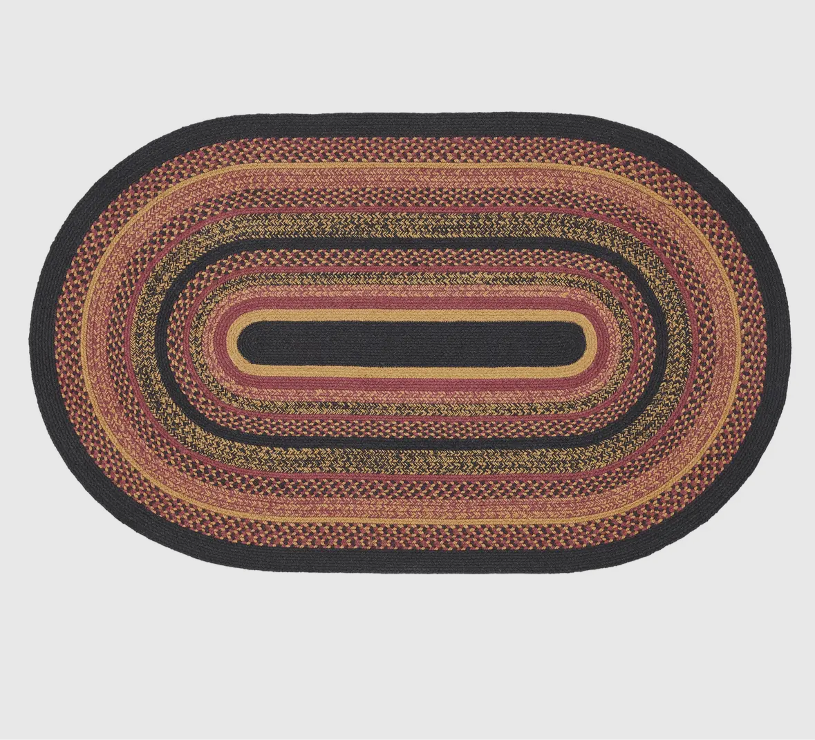 Enhance the look of your home with the 36x60 inch Heritage Farms Jute Oval Rug. This rug beautifully features mustard yellow, black, and burgundy braided jute blend fibers.