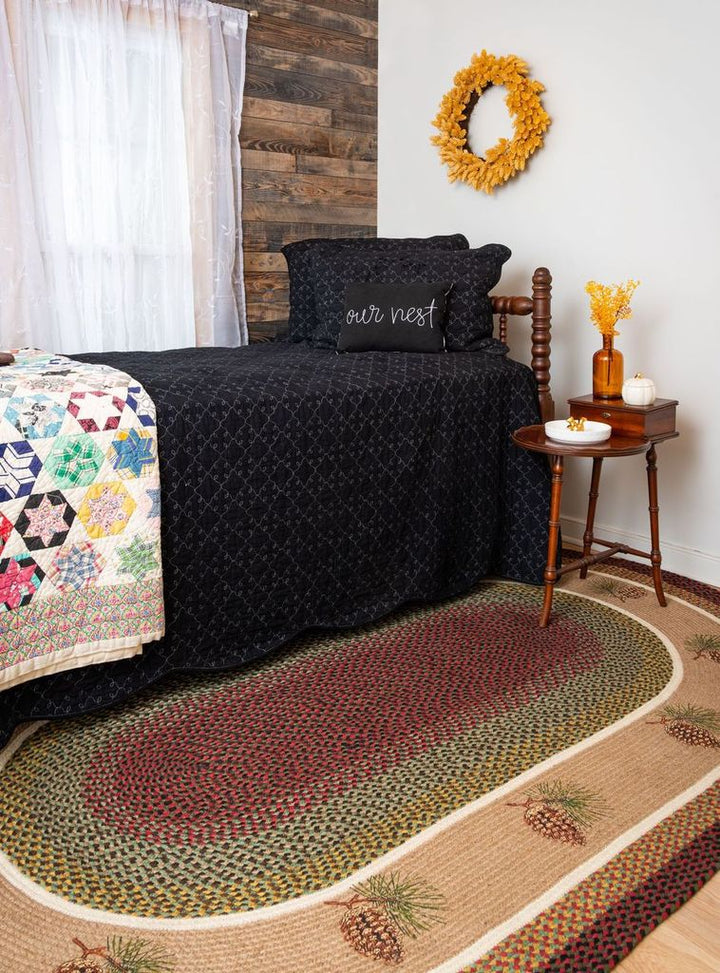 Bring the warmth of the season into your home with the Pinecone Oval Patch Braided Rug 🍂. Measuring 5'x8', this hand-stenciled jute rug features a rich earth-tone palette accented with pinecone motifs by artist Sandy Clough. The natural braided texture adds rustic charm, making it a beautiful focal point for your living room, dining room, or entryway.