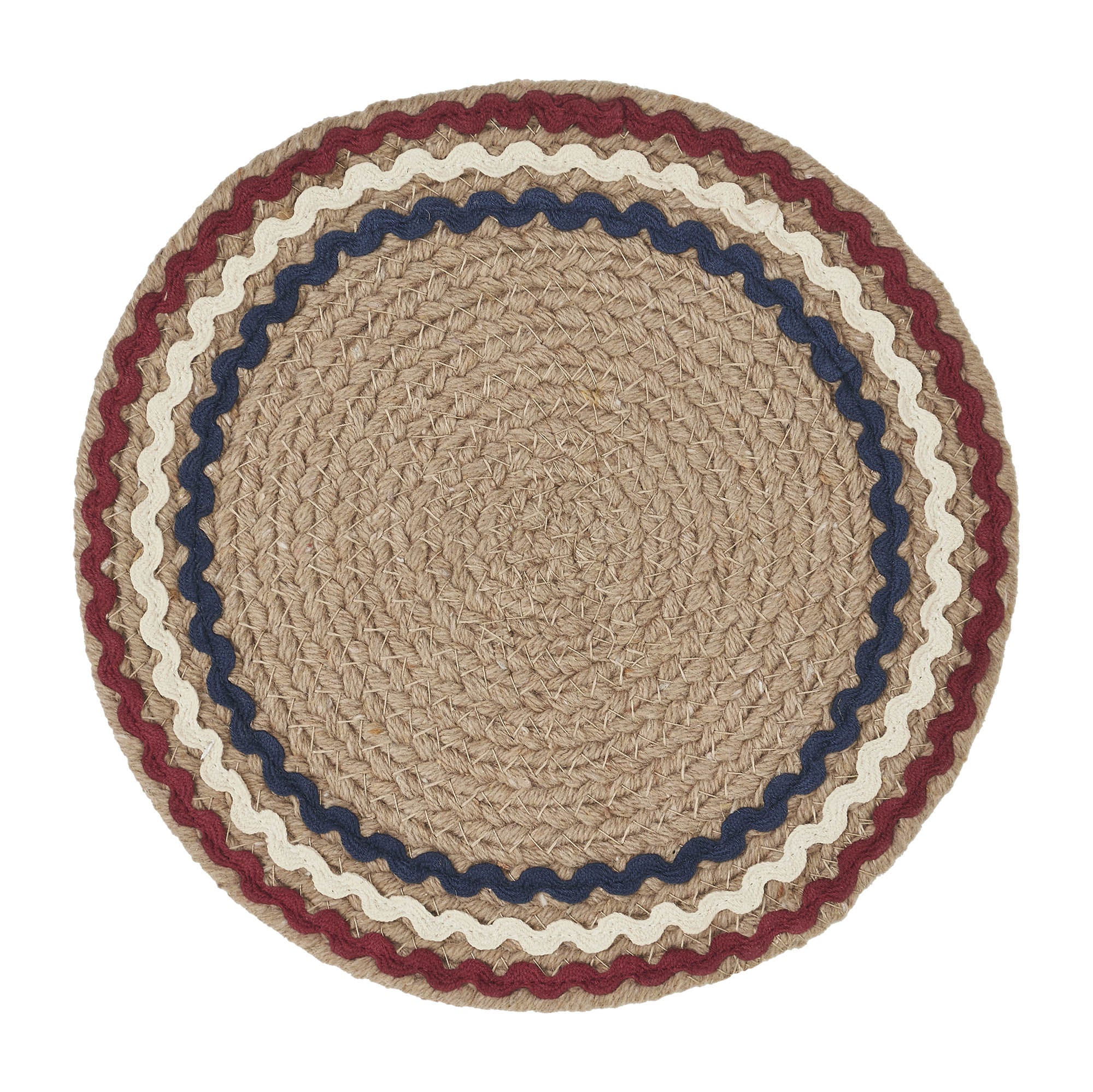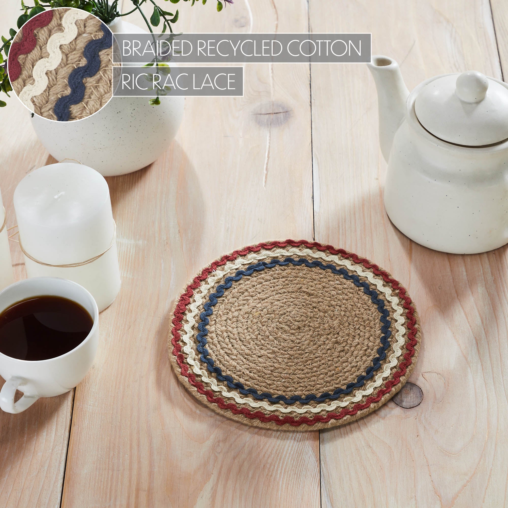 Size GuideAdd a touch of patriotic charm to your kitchen and dining space with the VHC Brands Patriotic Metal Red Blue Ric Rac Trivet 8 Inch Diameter. Crafted from durable recycled cotton in a natural tan color, this trivet is braided and tightly stitched to ensure lasting use without pulling or warping. The design is accented with three vibrant ric rac bands in dark red, creme, and navy blue, bringing a cheerful Americana vibe to your table. Perfect for protecting surfaces from hot pots, pans, and dishes, this versatile trivet is both functional and decorative. Its round shape and timeless color palette make it a great addition to rustic farmhouse and country-style interiors, complementing kitchen counters, dining tables, and even living room tabletops. Use it during Independence Day celebrations or throughout the year to showcase your patriotic pride in style. Caring for the VHC Brands Patriotic Metal Red Blue Ric Rac Trivet is simple-just hand wash it to maintain its vibrant colors and sturdy construction. Combining quality craftsmanship and classic design, this trivet is more than just a practical kitchen accessory; it's a stylish accent that adds warmth and character to your home. Celebrate the spirit of Americana while protecting your surfaces with this charming, functional decor piece.