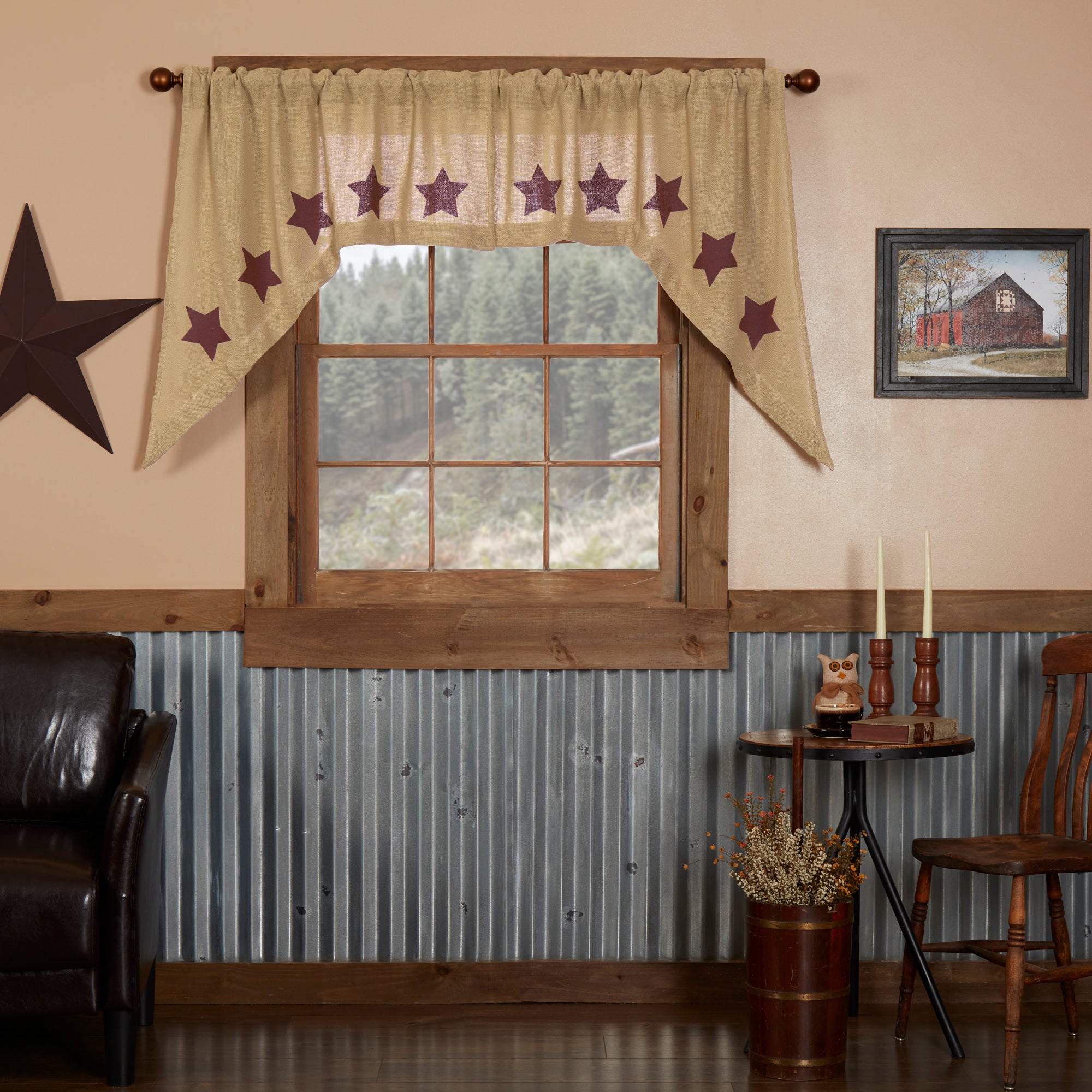 Burlap w/Burgundy Stencil Stars Swag Set features natural burlap with a rod pocket that measures 3.25 inch in height which allows for a wide variety of hardware to be used.