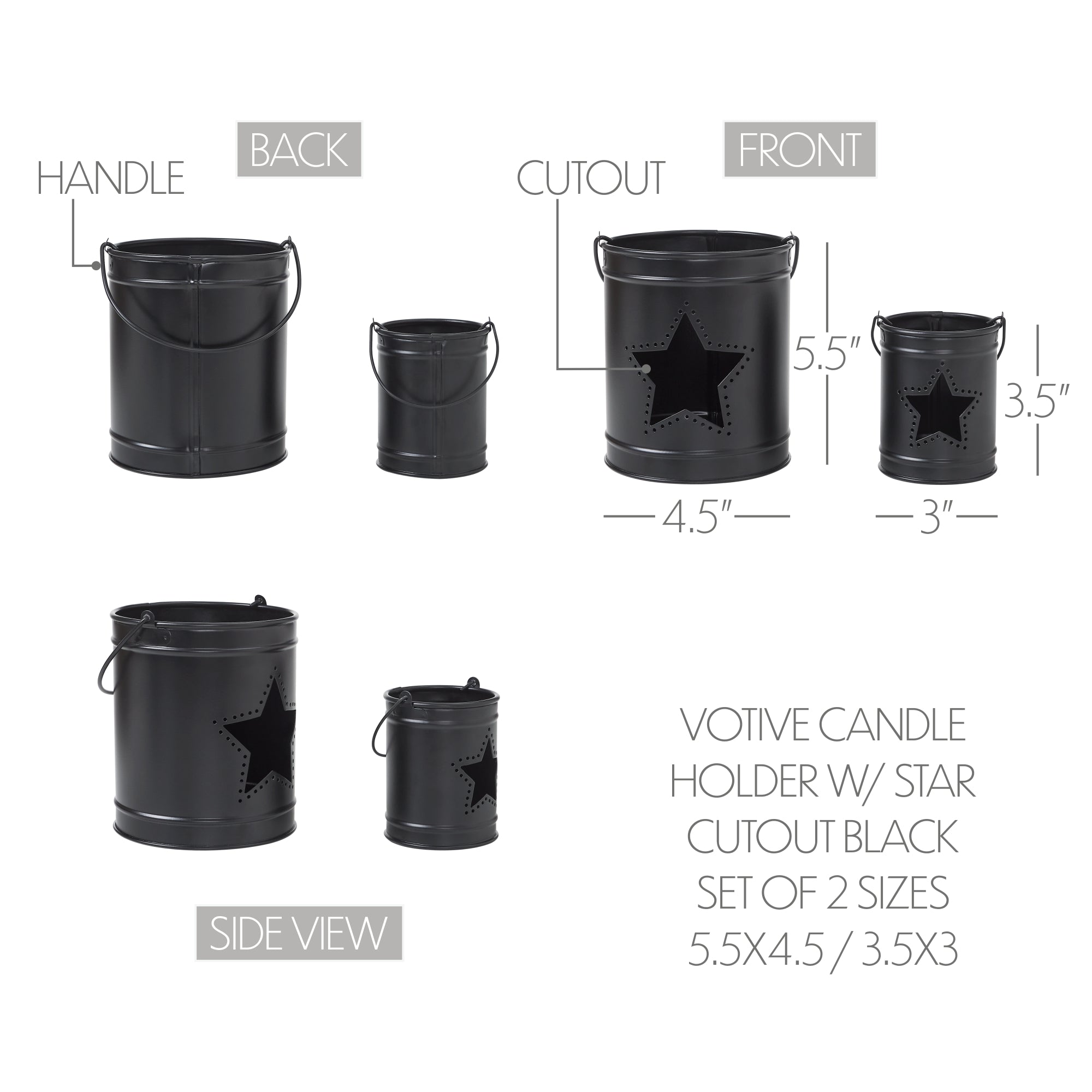 Add a touch of rustic charm to your Independence Day decor with the VHC Brands Patriotic Metal Votive Candle Holder w/ Star Cutout Set of 2 Sizes. This elegant set features two round metal votive holders in a classic country black finish, one measuring 5.5x4.5 and the other 3.5x3. Each holder is adorned with a large barn star cutout, accented by small round holes along the edges, creating a striking pattern that lets light shine through for a cozy, warm glow. Perfect for enhancing any room, this versatile set of candle holders adds ambiance and charm to living rooms, dining rooms, kitchens, bedrooms, bathrooms, or entryways. The timeless country black color and star cutout design make these pieces a seamless addition to farmhouse, rustic, and Americana-inspired interiors. Use them as a pair for a layered display or individually to add warmth and character throughout your space. Caring for the VHC Brands Patriotic Metal Votive Candle Holder Set is easy-just wipe clean with a soft cloth to maintain their classic finish. Whether used as centerpieces for Fourth of July celebrations or as everyday accents, these candle holders combine quality craftsmanship with a timeless aesthetic. They're the perfect way to bring light, warmth, and a touch of patriotic elegance to your home decor.