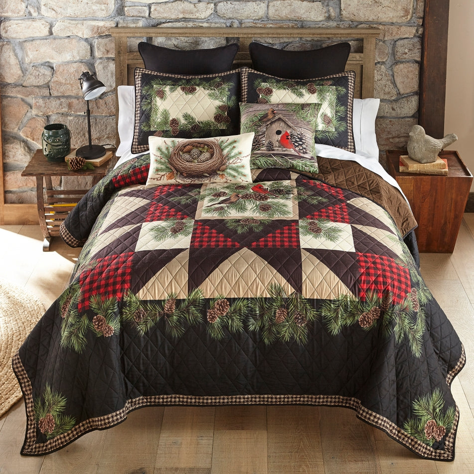 Size GuideBring rustic lodge charm to your bedroom with the Donna Sharp Cardinal Pine Quilt Collection. A timeless large-star quilt is framed with pine boughs, pinecones, and cardinal accents, with touches of red lumberjack plaid. The warm palette of ivory, tan, brown, deep red, and pine green creates a cozy woodland retreat you can enjoy year-round. Soft, breathable fabrication and easy care make this set as practical as it is beautiful.