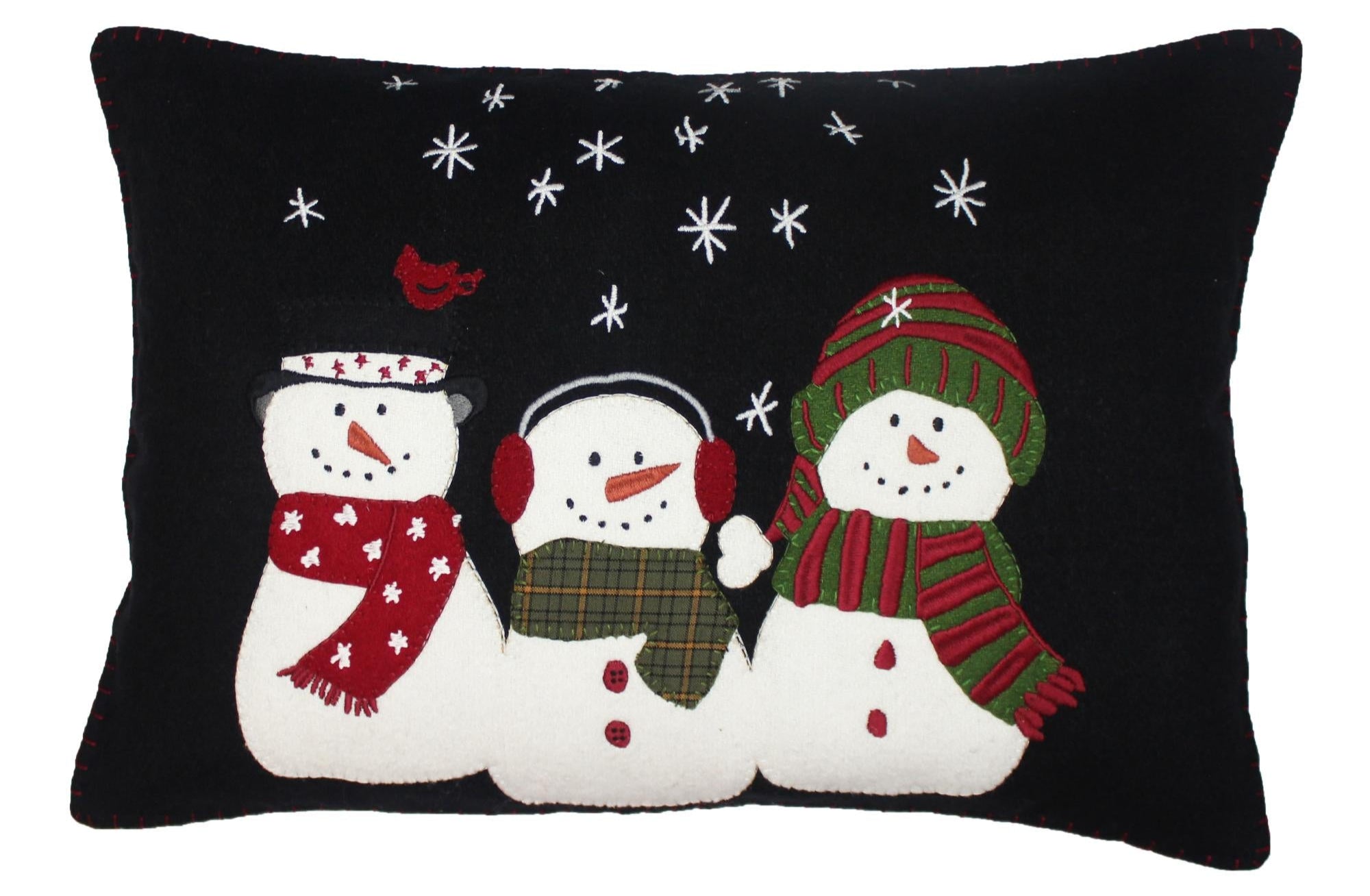 Size GuideBring cheerful charm to your winter décor with the Snow Friends Pillow. Three smiling snowmen—complete with cozy scarves, earmuffs, and a beanie—are appliquéd on a classic black backdrop with embroidered snowflakes and a red cardinal. The 14" x 20" lumbar shape is perfect for layering on a bench, chair, or bed for an instant touch of Christmas coziness. Coordinates beautifully with our winter plaids and farmhouse holiday accents.