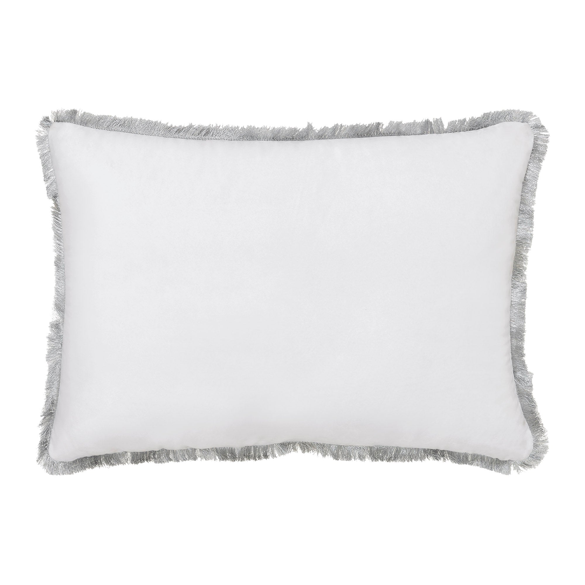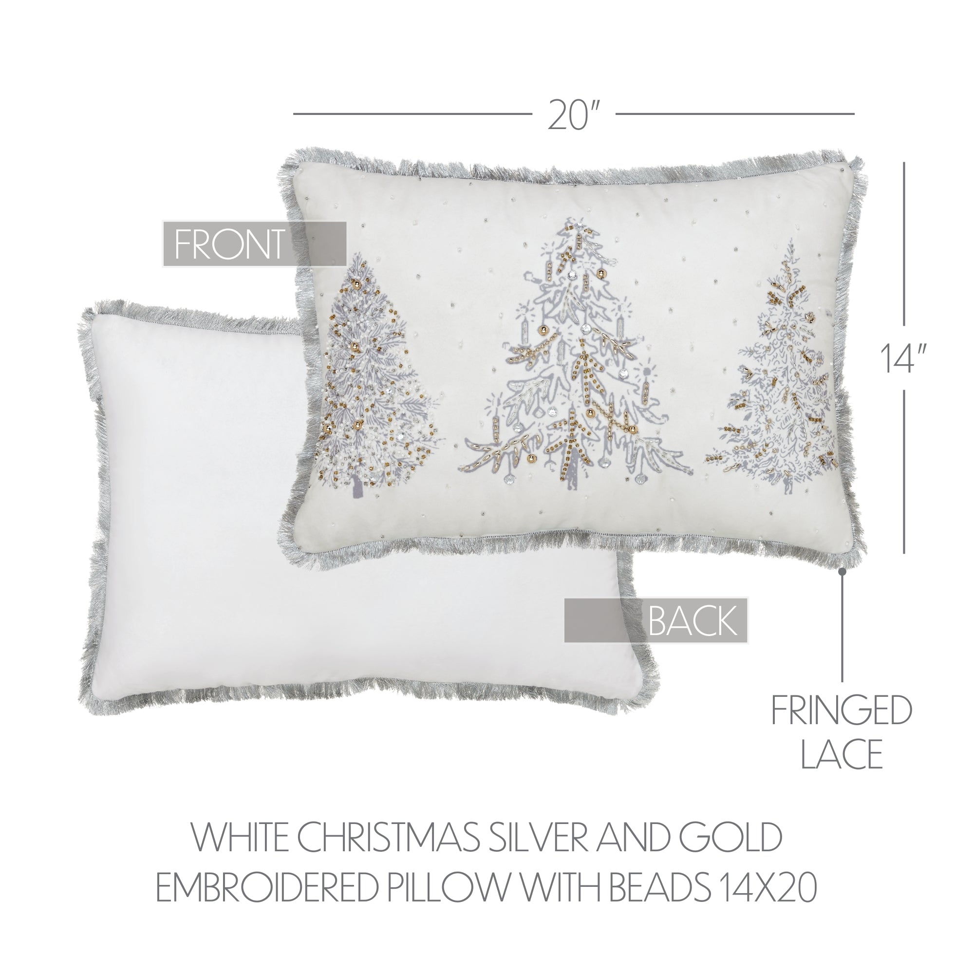 Size GuideAdd a touch of festive elegance to your home with the VHC Brands Christmas Embroidered Pillow with Beads. Designed for holiday charm, this 14x20 rectangular pillow features three beautifully printed Christmas trees in shimmering silver and gold. Each tree is delicately adorned with beaded accents, and tiny beads are scattered throughout the bright white background to create a subtle sparkle that catches the light. Crafted from soft polyester and finished with a refined silver fringe trim, this decorative pillow blends primitive rustic style with a hint of holiday glamour. The embroidered details and textured embellishments make it a standout accent in any Christmas decor arrangement. Whether placed on a couch, bench, or guest bed, it brings a warm and cheerful seasonal atmosphere to your space. Perfect for the bathroom, bedroom, dining room, entryway, kitchen, or living room, this pillow offers versatile placement across your home. Please note that it is intended for decorative use only and is not a toy-small parts may pose a choking hazard for children under 3. Spot clean as needed to maintain its festive beauty year after year.