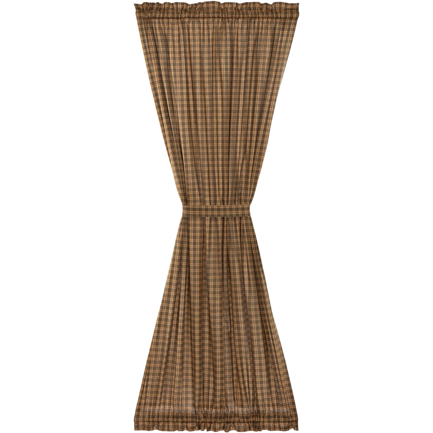 Size GuideA woodsy plaid in cedar green, dark brown and khaki tan provides a delightful country base for a primitive accent piece with vintage style and practical benefits. The Cedar Ridge Door Panel is a 72x40 inch panel crafted in 100 percent cotton with a light filtering lining for additional privacy. This country farmhouse French door panel features a 2 inch rod pocket for easy installation (rod not included). Machine wash on gentle for easy care and line dry for best results. The panel is iron safe. To give your home a complete rustic country look, pair with other items from the Cedar Ridge Collection including modern primitive swag, panel sets, kitchen accessories, bedding and more.