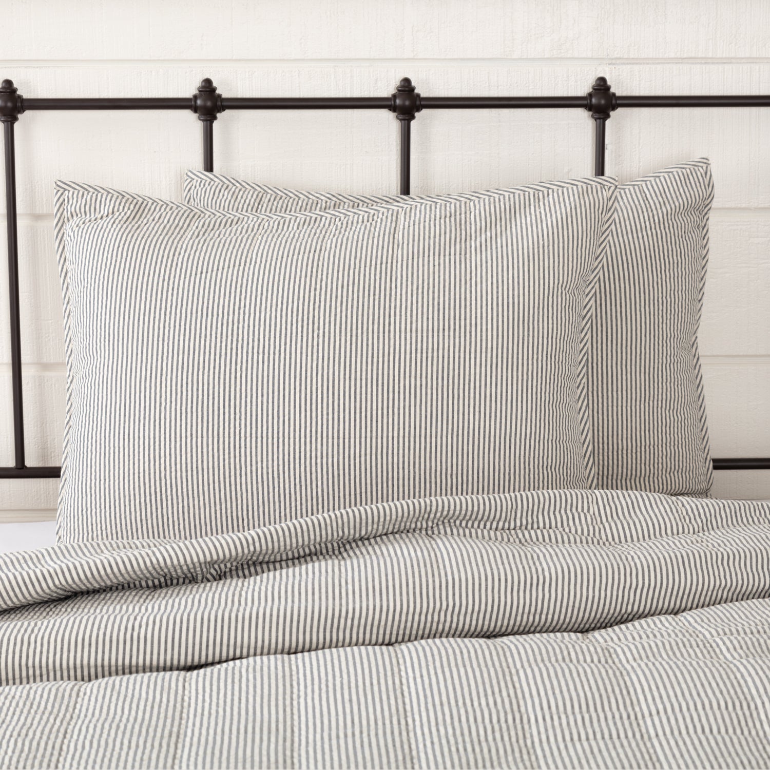 This quilt features soft seersucker ticking stripes in denim blue and cotton white, giving your space a cool, breezy, vintage-inspired look. Made from durable 100 percent cotton with detailed channel quilting, this coverlet is designed for comfort, quality, and years of enjoyment. The matching standard shams complete the look with crisp ticking stripes for a cohesive farmhouse style.