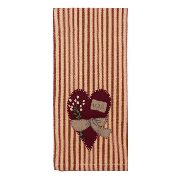 Celebrate the heart of the home with this beautifully crafted and practical kitchen accessory. The new Big Heart towel features an endearing heartfelt design that's versatile for many home decor styles and perfect as a gift to let someone now you care. A great option for Valentine's Day and all year long. - Measures 18" x 28" - Made of 100% Cotton - Features York Ticking Barn Red towel with applique and embroidered details - Machine wash cold gentle cycle or spot clean