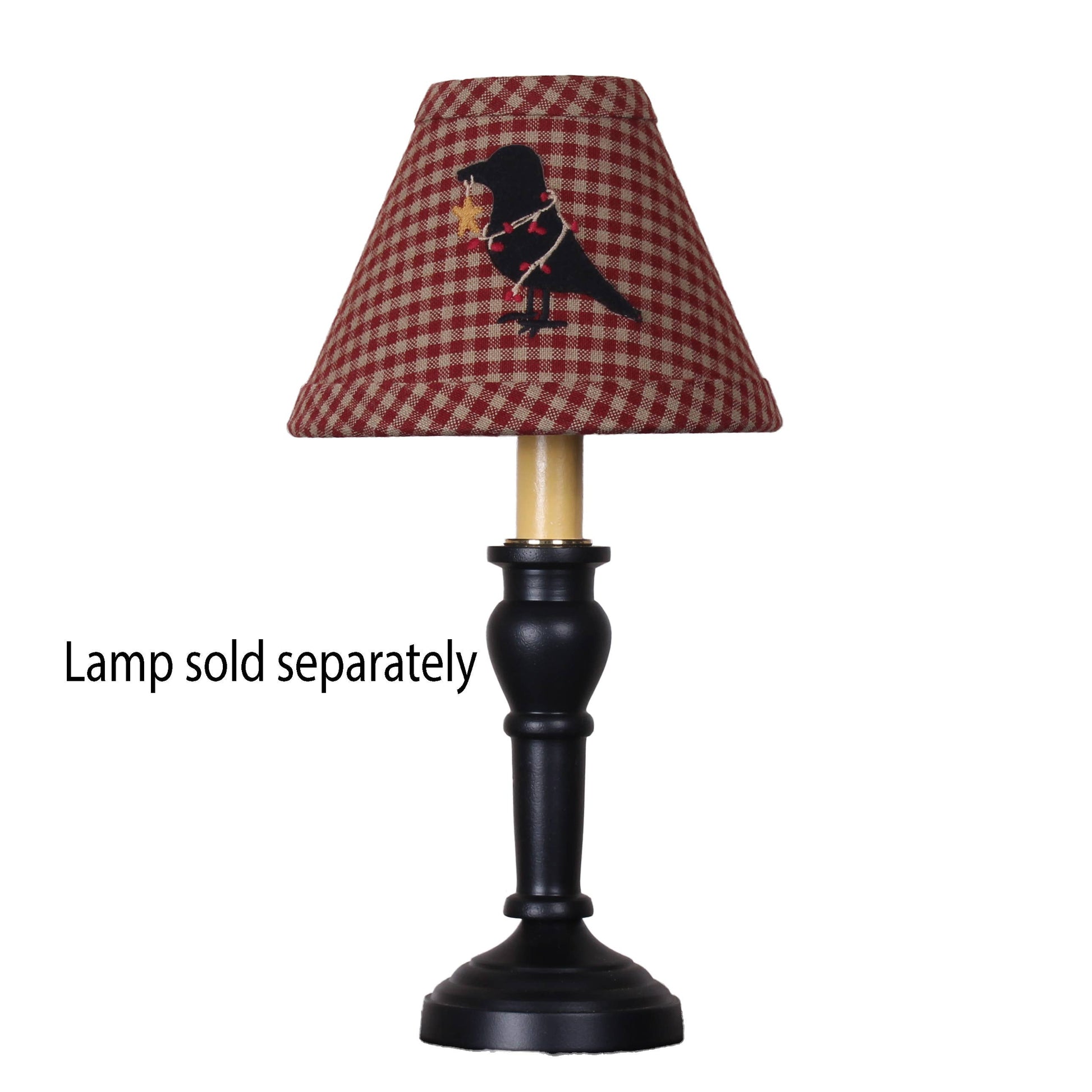 Size GuideIntroducing our new Crow and Berries 6" shade featuring the popular design of its namesake towel. Whether you're aiming for a cozy rustic vibe or a classic country aesthetic, this lampshade effortlessly adds charm to your decor. Part of our new decorative 6" shade collection, shade was designed for our popular Wellington Spindle Candle lamps (sold separately). - Measures 2.5" at the top, 6" at the bottom and 4.5" high - Newbury Barn Red Gingham cotton fabric - Applique black crow with embroidered details - Side stitching for durability - Candle bulb clip