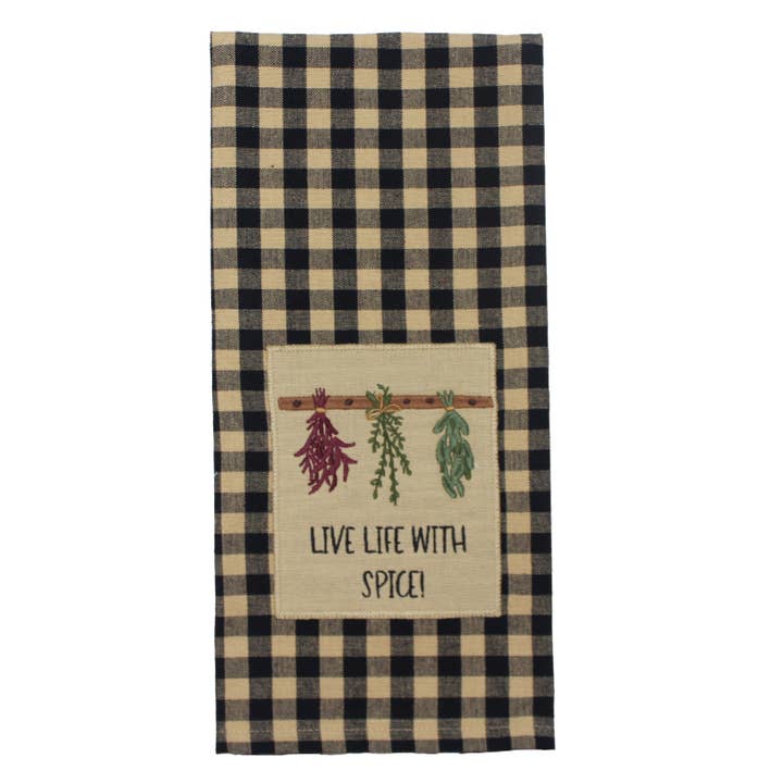 Introducing the new Live with Spice Towel, a charming addition for kitchen décor. Featuring a delightful embroidered design, it adds a touch of character and charm to any space. Embrace the warmth and simplicity of country living with this beautifully designed towel. - Measures 18" x 28" - Made of 100% Cotton - Features Heritage House Check Black towel with embroidered design - Machine wash cold gentle cycle or spot clean