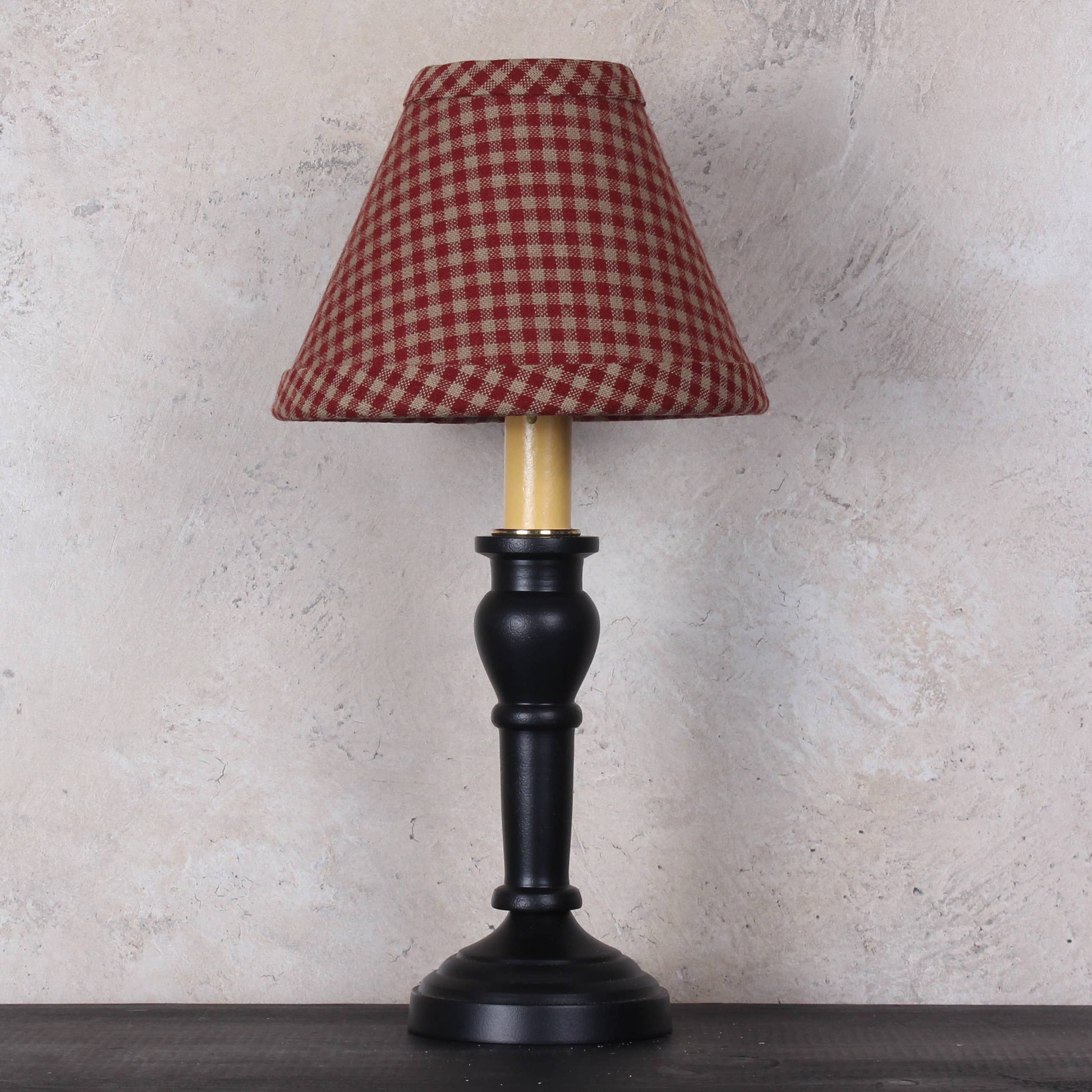 Size GuideWe've added a new 6" shade to our popular Newbury Gingham Barn Red Collection! Featuring a classic barn red and oat check, the shade adds a finishing touch to your favorite candle lamp or chandelier. Also pairs perfectly with our popular Wellington Spindle Candle lamps (sold separately). - Measures 2.5" at the top, 6" at the bottom and 4.5" high - Newbury gingham barn red cotton fabric - Side stitching for durability - Candle bulb clip