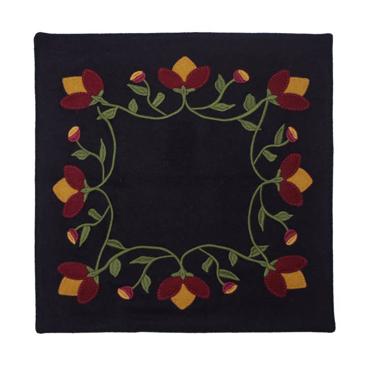 Size GuideOur Primitive Border Candle Mat is versatile complimenting many home decor styles and provides both functionality and classic styling for the table. - Measures 15" x 15" - Made from high-quality black wool felt, ensuring durability while showcasing intricate details. - Features a beautiful applique and embroidered design in rich tones of reds, golds and greens - Easy to care for with spot cleaning