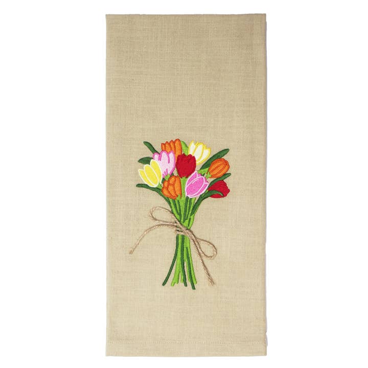 The new Tulips Towel is crafted from soft, high-quality cotton and adorned with a cheerful tulip embroidered design. It adds a bright and festive touch to your kitchen or bathroom, perfect for celebrating Easter and welcoming spring. Both decorative and practical, this towel brings a fresh, floral charm to your home or makes a thoughtful seasonal gift. - Measures 18" x 28" - Made of 100% Cotton - Features embroidered design with jute string tie - Machine wash cold gentle cycle or spot clean
