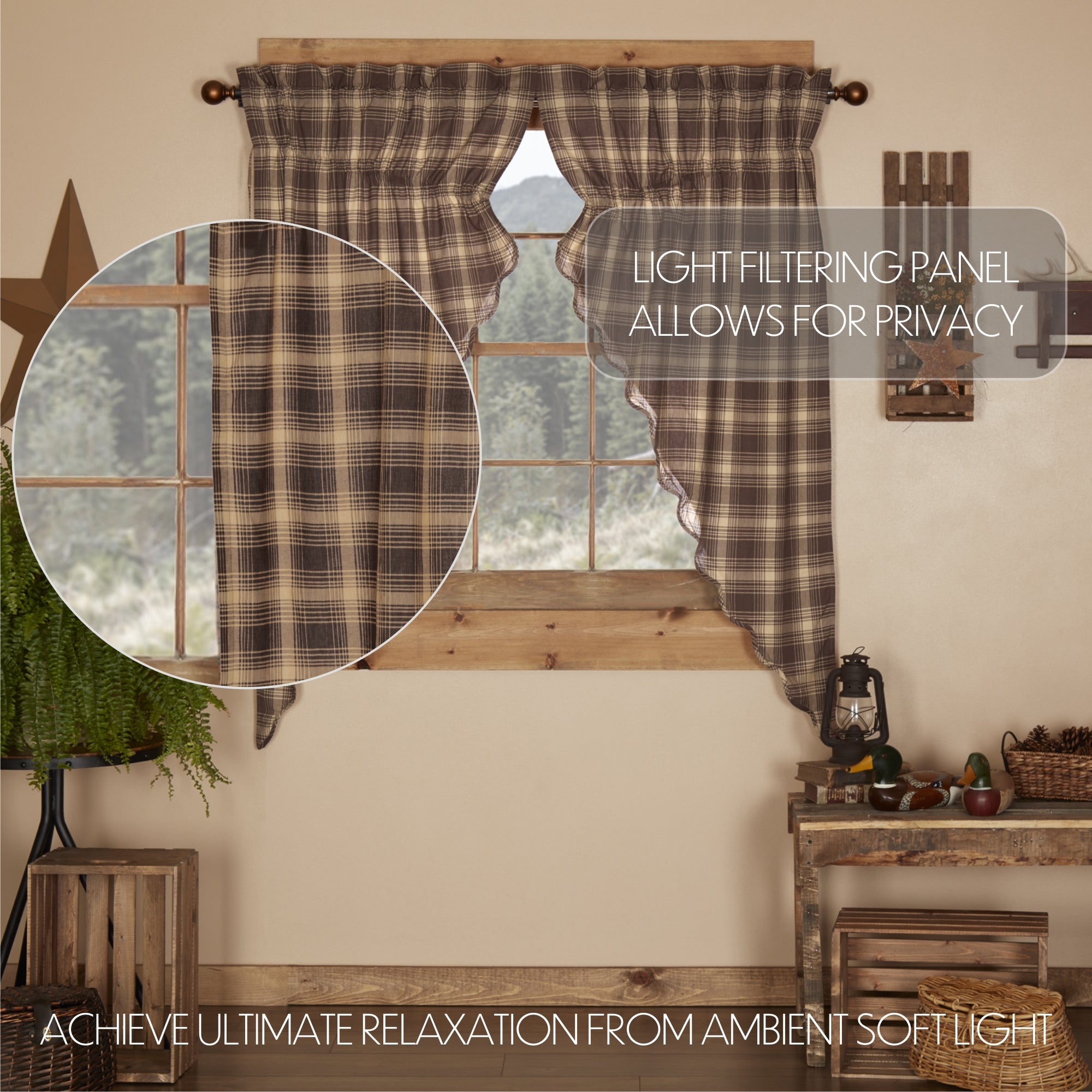 Size GuideDecorate your windows with a touch of relaxed, rustic country style with this charmingly designed and thoughtfully crafted window panel set. Displaying a timeless country look with a muted, cabin-inspired traditional plaid in woodland brown and khaki tan with scalloped edging, the Dawson Star Short Prairie Panel Set 63x36x18 enhances your home decor with a relaxed, cozy lodge feel. The gracefully angled drapes perfectly frame windows providing a bit of polish for your home. Our fully lined prairie panels come with built in drawstrings to adjust each panel to meet your style needs, along with a curtain rod pocket for easy hanging. Includes two matching panels for a perfectly dressed kitchen or living room window.