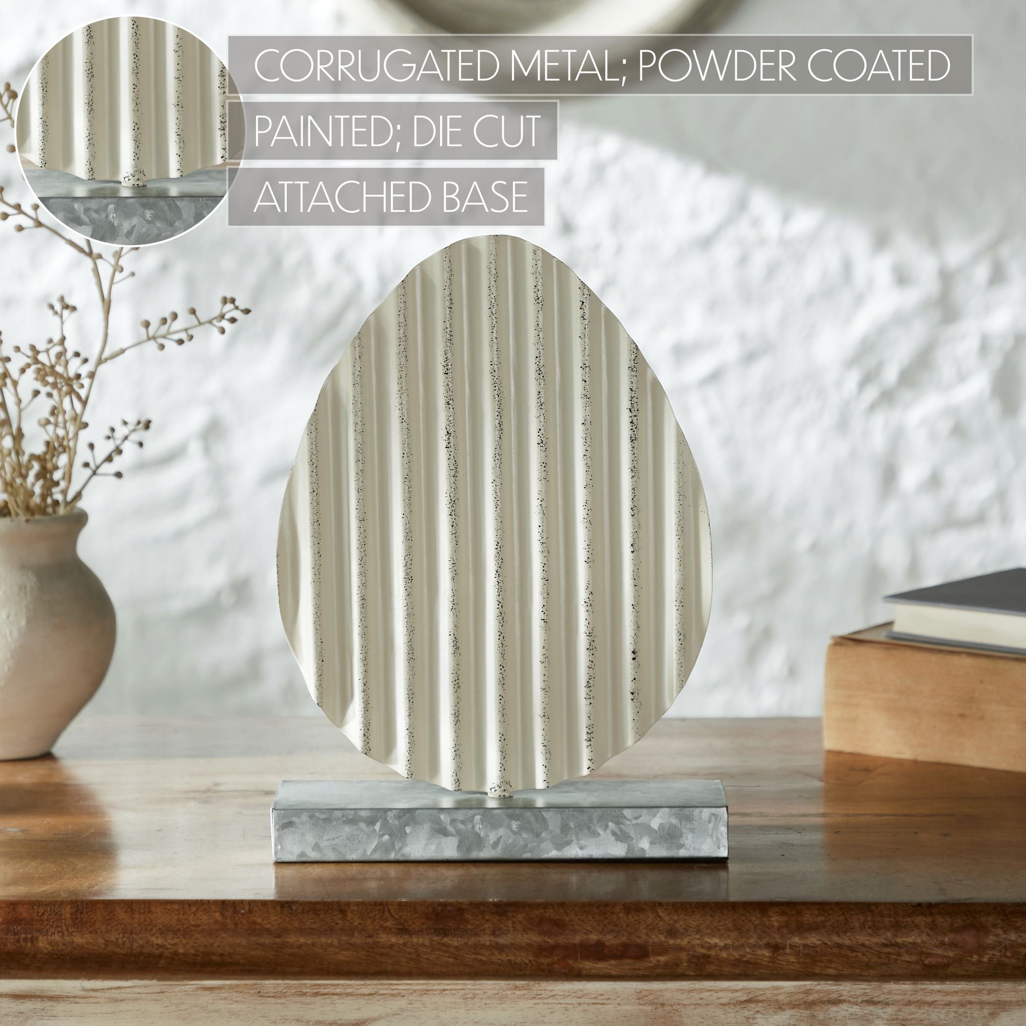 Size GuideElevate your spring and Easter decor with the VHC Brands Bunny Hop Corrugated Metal Egg. This charming figurine features a corrugated metal egg with a sophisticated aged ivory finish, adding a rustic and primitive touch to any space. The egg stands elegantly on a galvanized grey metal base, creating a striking contrast and enhancing its vintage appeal. Measuring 8x11 inches, this decorative piece is versatile enough to complement various settings, whether displayed in your bathroom, bedroom, dining room, entryway, kitchen, or living room. The solid color design and corrugated texture provide a unique, eye-catching element that seamlessly integrates into both modern and traditional decor styles. To maintain its pristine appearance, simply wipe the metal surface clean with a soft cloth. The combination of aged ivory and galvanized grey offers a refined country charm that perfectly captures the essence of spring. Add this rustic egg to your home decor collection and enjoy its timeless elegance throughout the season.