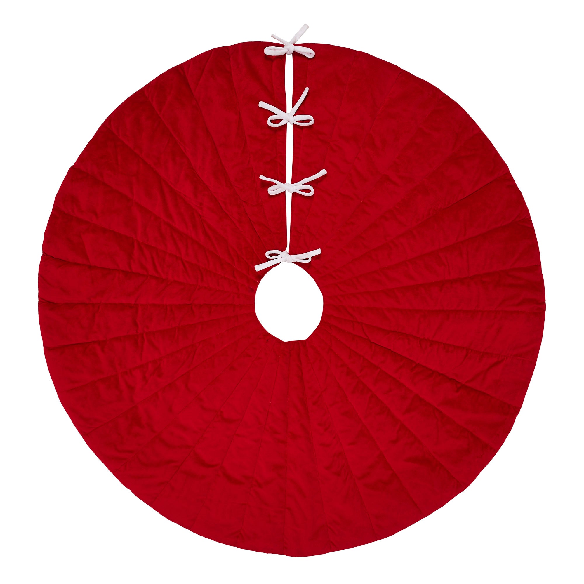 Bring vibrant holiday warmth to your decor with the VHC Brands Quilted Velvet Christmas Tree Skirt with Bow Ties in bright red. Measuring 48x48 inches, this plush tree skirt features a solid red velvet fabric with elegant channel quilting that adds texture and richness to your festive setup. Bright white bow ties secure the opening, offering a striking contrast and a classic seasonal touch. Crafted from durable polyester, this round tree skirt combines style with practicality, protecting your floors while beautifully framing your Christmas tree. The solid color velvet fabric lends a cozy, luxurious feel that perfectly complements primitive rustic, farmhouse, and traditional holiday themes. Its simple yet festive design makes it a versatile and elegant addition to any holiday space. Ideal for display in any room-bathroom, bedroom, dining room, entryway, kitchen, or living room-this Quilted Velvet Christmas Tree Skirt with Bow Ties adds cheerful color and refined charm to your home. Spot clean only to maintain its vibrant look and softness year after year. This stunning tree skirt is a festive essential that completes your holiday decor with warmth and grace.