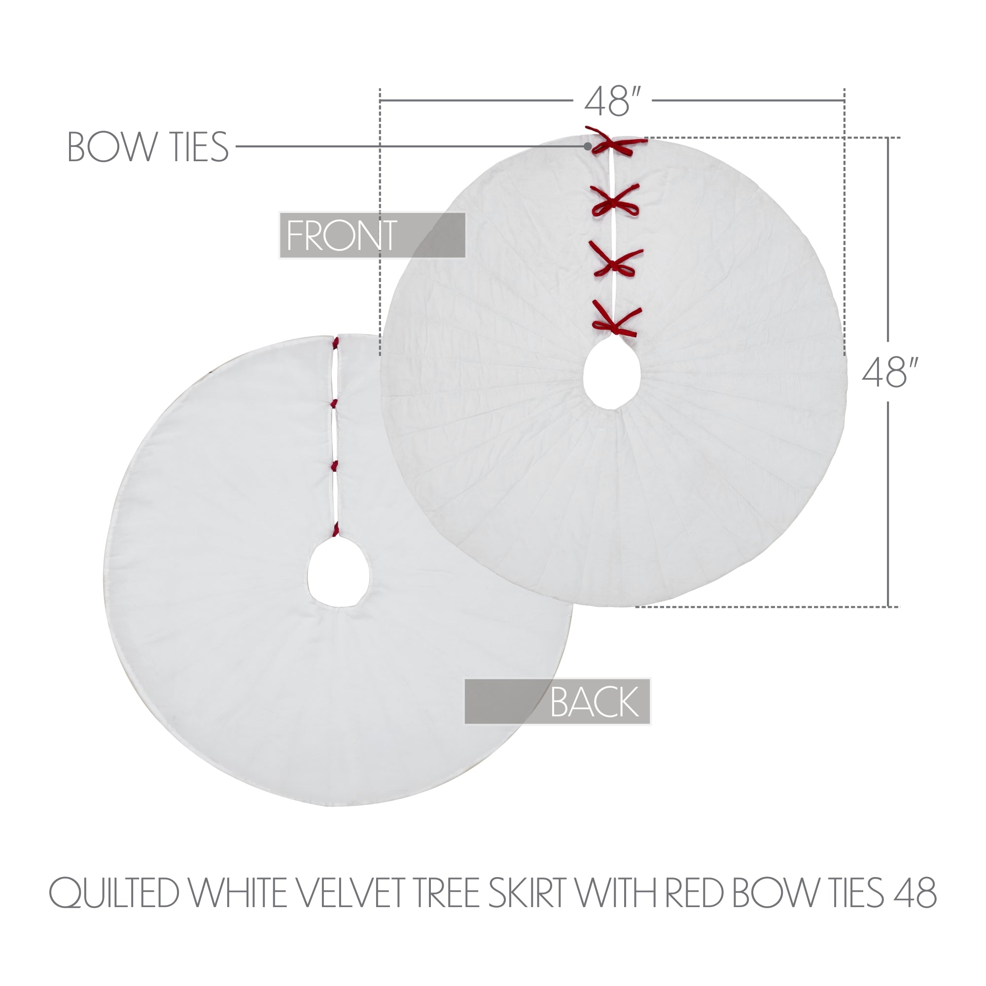Size GuideAdd a touch of timeless elegance to your holiday decor with the VHC Brands Quilted Velvet Christmas Tree Skirt with Bow Ties. Measuring 48x48 inches, this luxurious tree skirt features a solid bright white velvet fabric with channel quilting that adds texture and depth to your festive display. Bright red bow ties secure the opening, providing a charming contrast and classic holiday accent. Crafted from durable polyester, this round tree skirt offers both style and functionality, protecting your floors while enhancing the beauty of your Christmas tree. The solid color velvet fabric brings a plush, cozy feel that complements primitive rustic, farmhouse, and traditional holiday themes. Its clean and simple design makes it a versatile and sophisticated addition to any seasonal setting. Perfect for use in any room-bathroom, bedroom, dining room, entryway, kitchen, or living room-this Quilted Velvet Christmas Tree Skirt with Bow Ties adds warmth and festive charm to your home. Spot clean only to maintain its pristine appearance and vibrant colors year after year. This elegant tree skirt is a must-have accessory that completes your holiday decor with style and grace.