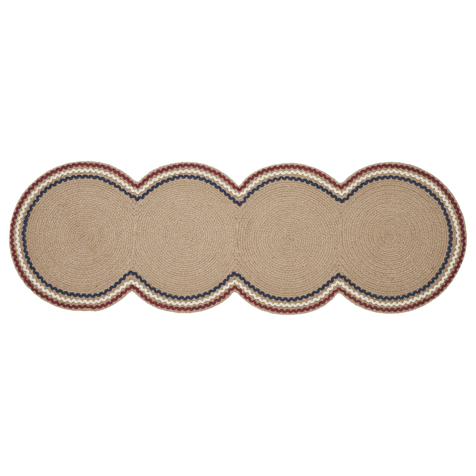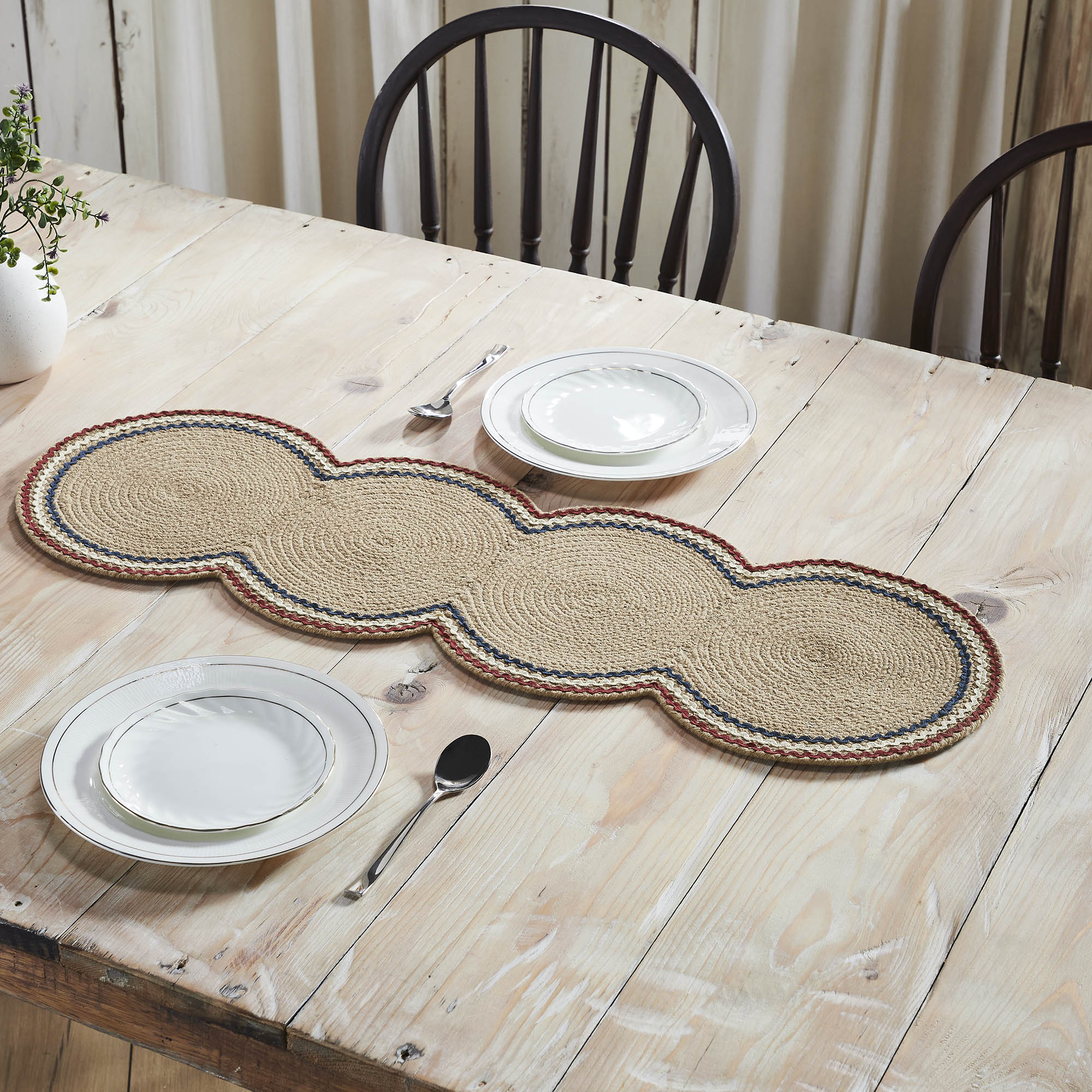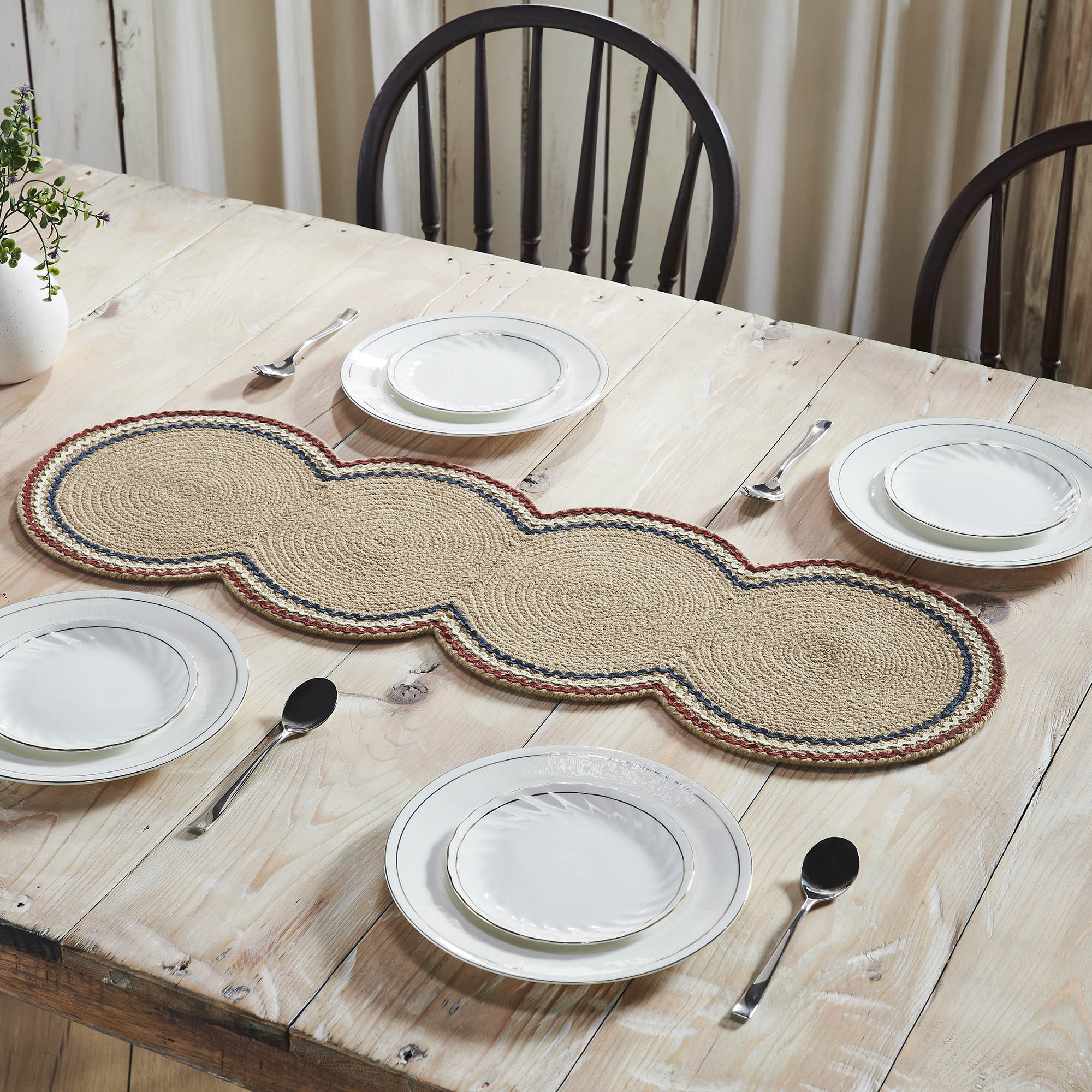 • Patriotic Design: Features a natural tan braided base with three colorful rick rack bands in dark red, creme, and navy blue, perfect for adding a festive, patriotic touch to your table settings.