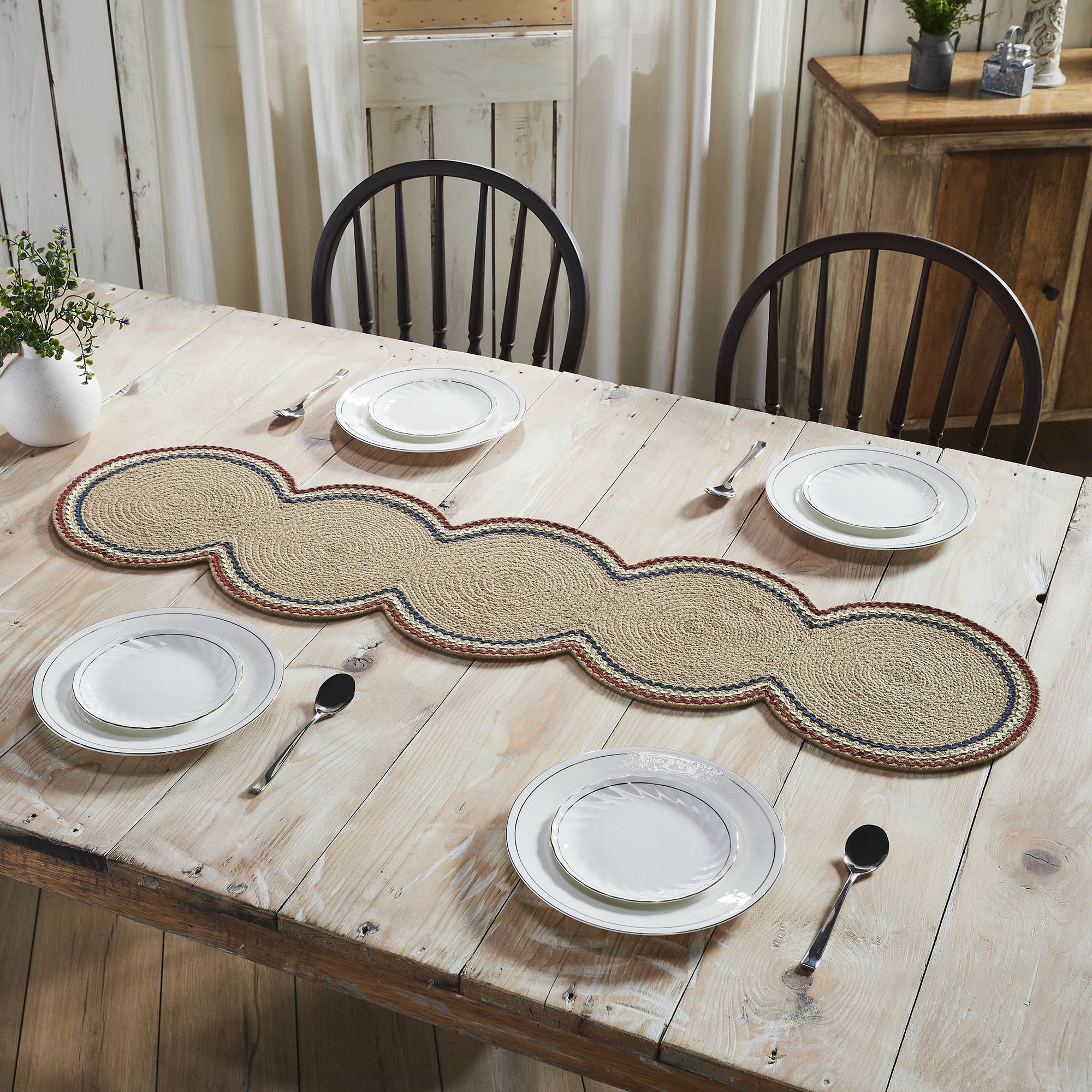 • Timeless Americana Style: The combination of natural tan with rich red, creme, and navy blue accents creates a classic Americana look, perfect for your country or rustic-themed dining room.