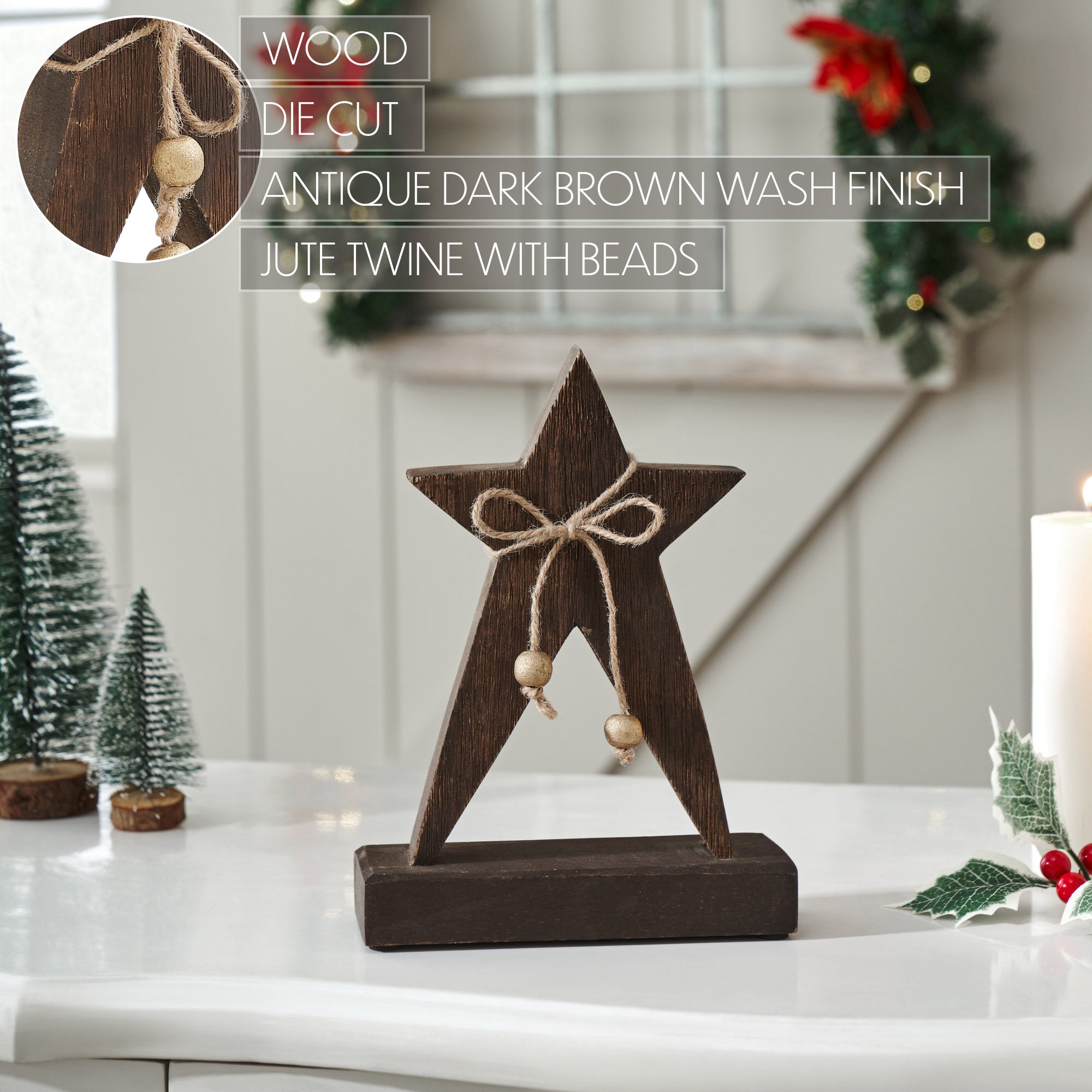 Add a rustic touch of holiday charm to your seasonal decor with the VHC Brands Primitive Wonder Dark Wooden Star. This 6x8 decorative figurine features a classic five-pointed star crafted from tropical wood and painted in a deep brown hue with subtle light tan distressing. The vintage-inspired design is securely affixed to a wood base, making it a sturdy and stylish accent for any tabletop or shelf. A twine bow tied at the base, complete with small wood beads, adds a handcrafted, primitive feel that enhances the overall rustic aesthetic. The solid color palette and distressed finish make it a versatile addition to traditional, farmhouse, or woodland Christmas themes. Whether used on its own or as part of a larger arrangement, this star brings warmth and a quiet elegance to your winter display. Perfect for use in the bathroom, bedroom, dining room, entryway, kitchen, or living room, the Primitive Wonder Dark Wooden Star offers timeless appeal throughout the holiday season. Built to last and easy to maintain, simply wipe clean with a soft cloth to keep it looking its best year after year. It's a simple yet meaningful addition to your Christmas decor collection.