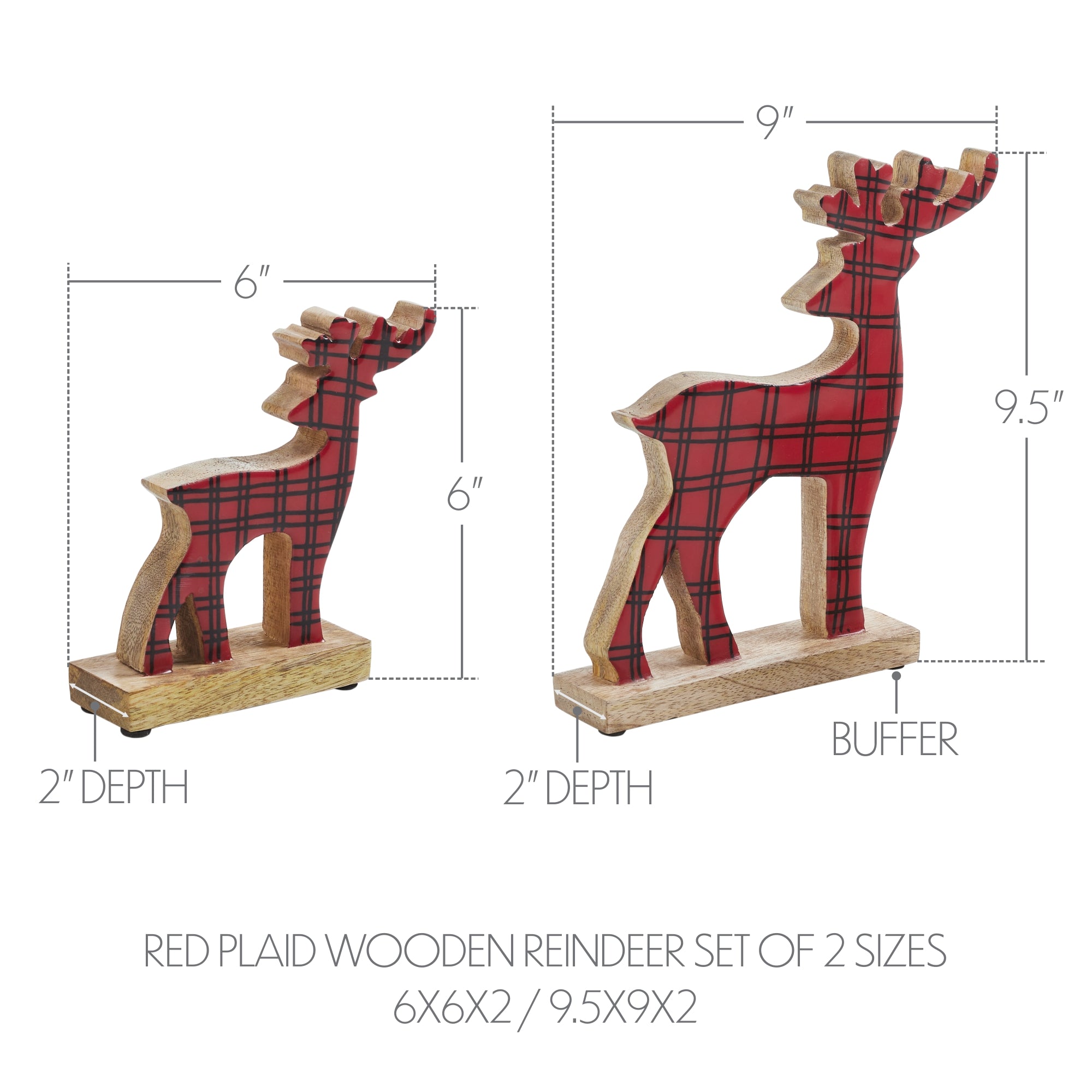 Add a cozy, festive touch to your holiday decor with the VHC Brands Plaid Wooden Reindeer Set of 2. These charming figurines feature two tall reindeer crafted from tropical wood, each adorned with a classic red and black plaid pattern on the front. The light natural wood base provides a warm, rustic contrast, creating a perfect blend of traditional and farmhouse Christmas style. Each reindeer is securely mounted on a wood base, making them ideal for display on mantels, tabletops, or shelves. The vibrant plaid design adds a pop of seasonal color, while the natural wood tones keep the look grounded and versatile. This set pairs beautifully with other rustic or primitive holiday decorations, adding a cheerful and welcoming vibe to your festive arrangements. Perfect for use throughout your home-in the bathroom, bedroom, dining room, entryway, kitchen, or living room-the Plaid Wooden Reindeer Set brings classic holiday charm to any space. Easy to maintain, simply wipe clean with a soft cloth to preserve their festive look year after year. This delightful duo is a timeless addition to your Christmas collection, embodying the warmth and joy of the season.