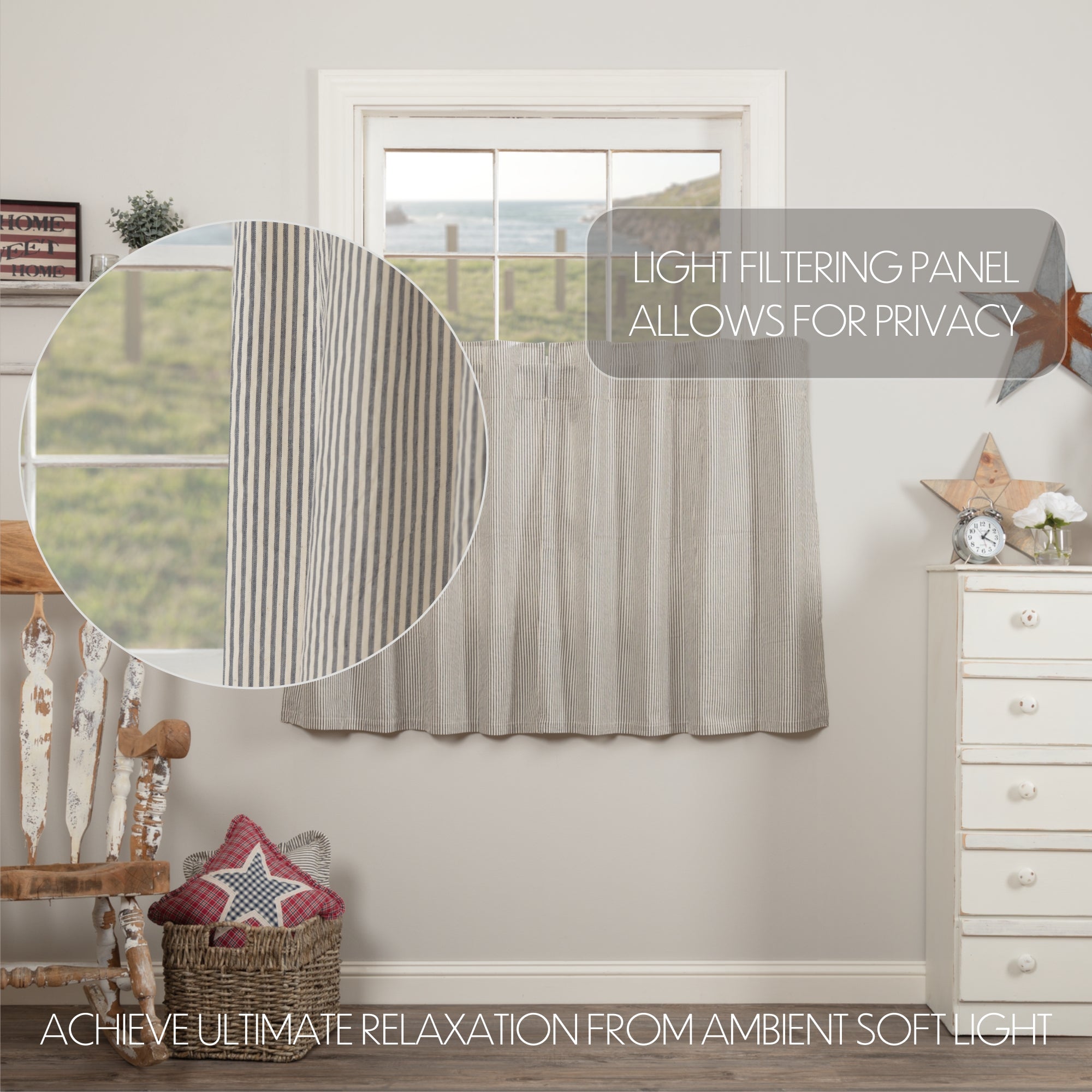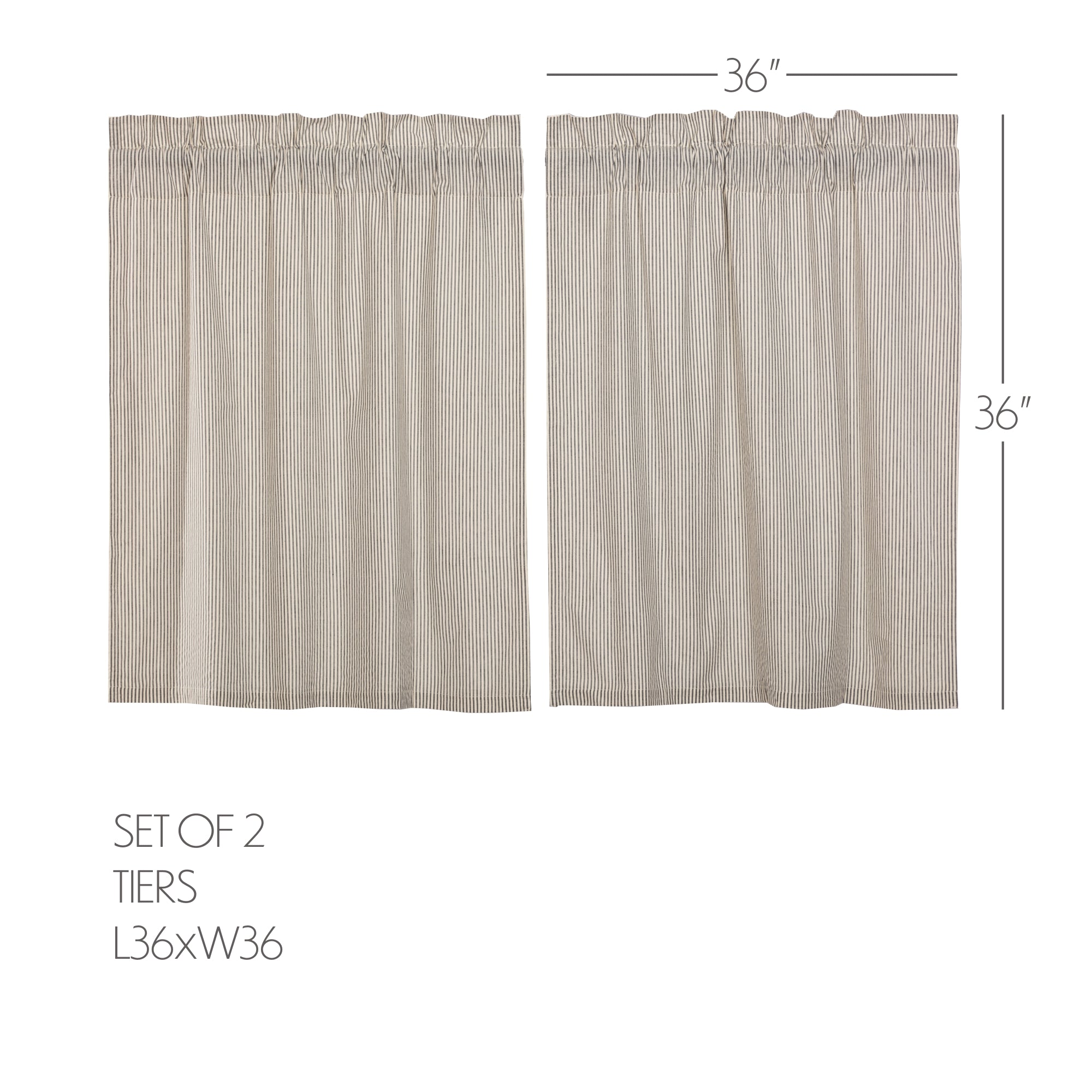 Size GuideCreate the perfectly charming country window of your dreams with these 36 x 36 inch tier-style curtains. Featuring a casual denim blue and cotton white ticking stripes on quality seersucker material, the Hatteras Seersucker Blue Ticking Stripe Tier Set provide just the right balance of privacy and sunshine. Pair with a matching valances or prairie swag for a fully decorated look or alone for a simple pop of color and character. Also known as cafe or bistro curtains, these are a particularly good fit for decorating vintage or Americana kitchens, living rooms, and small bathroom windows.