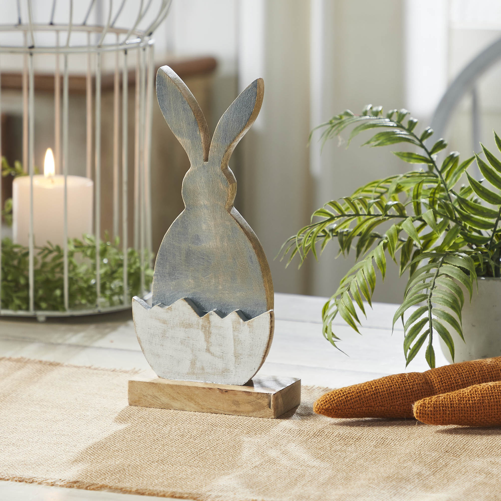 Introducing the VHC Brands Bunny Hop Wooden Half Egg with Grey Bunny Silhouette, a captivating addition to your Easter and spring decor. Measuring 5x10.5 inches, this charming figurine is expertly crafted from tropical wood, showcasing a beautifully distressed storm grey bunny silhouette nestled inside a worn white broken eggshell. The design features a rustic color palette of storm grey, worn white, and natural wood brown, evoking a vintage and primitive charm that captures the essence of a classic Easter celebration. This piece is perfect for adding a touch of whimsical elegance to your home decor. Ideal for enhancing any room with a farmhouse or country-style interior, the Bunny Hop Wooden Half Egg with Grey Bunny Silhouette brings a cozy and inviting atmosphere. Whether placed on a shelf in the bathroom, as a centerpiece on a dining room table, or as a delightful accent in the kitchen or living room, this figurine adds a playful and nostalgic vibe. The color block design and painted finish highlight the craftsmanship and attention to detail, making this piece a standout addition to your seasonal decorations. The vintage Easter bunny theme, combined with the distressed and worn look, makes it a timeless piece that adds character and charm to any space. Designed for easy care, this figurine can be wiped clean with a soft cloth, ensuring it remains a cherished part of your decor for years to come. Its versatile size and enchanting design make it an ideal decorative accent for various settings, from a cozy bedroom nook to a welcoming entryway display. Celebrate the joy and renewal of Easter with the VHC Brands Bunny Hop Wooden Half Egg with Grey Bunny Silhouette, a beautifully crafted piece that brings the spirit of the season into your home. Its delightful vintage charm and rustic elegance make it a perfect addition to your springtime celebrations, adding a whimsical touch to any decor.