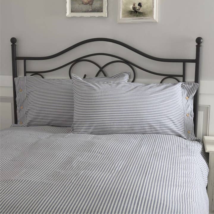 We were inspired by the ticking fabrics we've seen and we decided to create our own! The Farmhouse Ticking Blue Collection is available exclusively at Piper Classics and we think it's the perfect complement to your country farmhouse decor. Our sham features a woven denim blue ticking stripe on antique white base. The Sham reverses to the same as front, with 3 wooden button closures and 1 spare hidden button with 3 overlap to conceal insert. The stripes on sham run horizontally, with a trimmed edge in the same material running vertically. Ever-popular and classic, ticking fabric remains fresh and up-to-date, coordinating effortlessly with other fabric collections for a mix-and-match look.