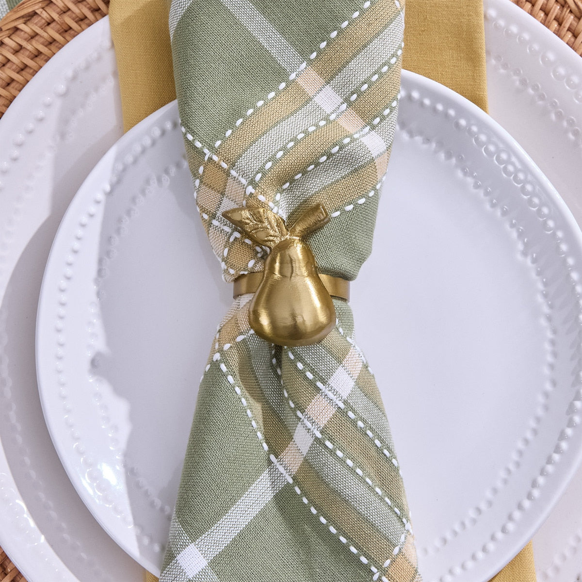 Add a warm, elegant touch to your table with these golden pear napkin rings. The smooth metallic finish layers beautifully with everyday plaid or holiday linens and brings a little shine to each place setting.