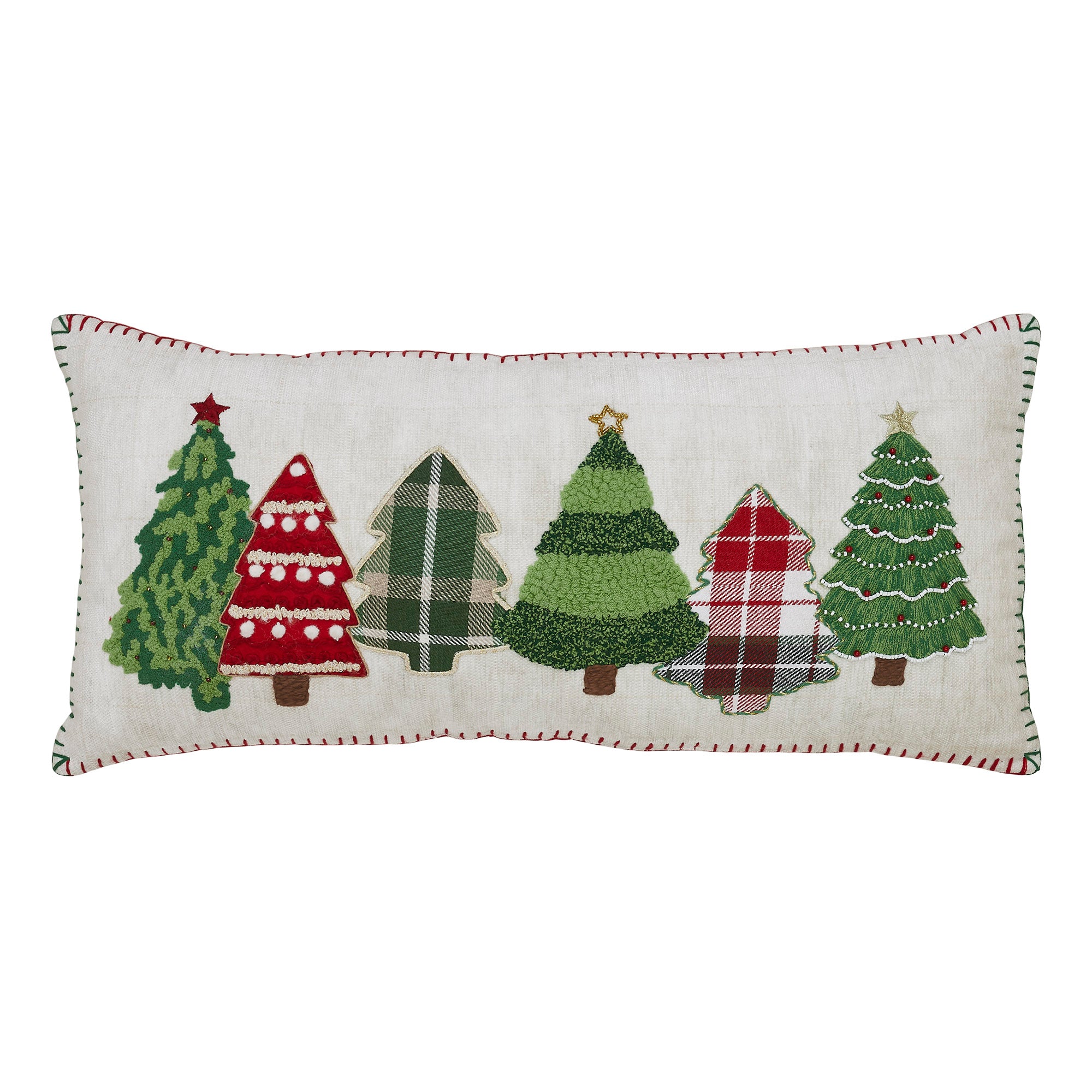 Size GuideCelebrate the season with the VHC Brands Applique Tree Pillow with Embroidery, a charming addition to your Christmas and winter decor. Measuring 14x30, this rectangular pillow features six festive Christmas trees, each uniquely appliqued and embroidered in traditional red and green tones on a soft creme fabric base. With its eye-catching holiday motifs, this pillow brings cheerful warmth to any room. Each tree showcases distinct seasonal accents such as bead embellishments, colorful trims, and puffy embroidery, adding texture and personality to the overall design. The handcrafted look is completed with red and green whip stitch edging, reinforcing the rustic, primitive style that's perfect for cozy holiday settings. Made with a cotton and polyester blend, the pillow balances comfort with durability. Ideal for use in the bathroom, bedroom, dining room, entry, kitchen, or living room, this decorative pillow makes a delightful statement throughout your home. Please note that this item is intended for decorative use only and is not a toy. Due to the inclusion of small parts, it is not suitable for children under 3 years old. Spot clean to preserve its festive charm for seasons to come.