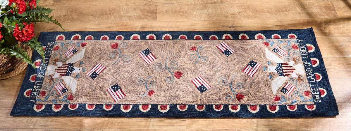 Celebrate classic Americana style with the Sweet Land of Liberty Hooked Rug Runner. Featuring warm tones, vintage-inspired flags, and timeless detailing, this piece brings a rich, patriotic charm to your home.