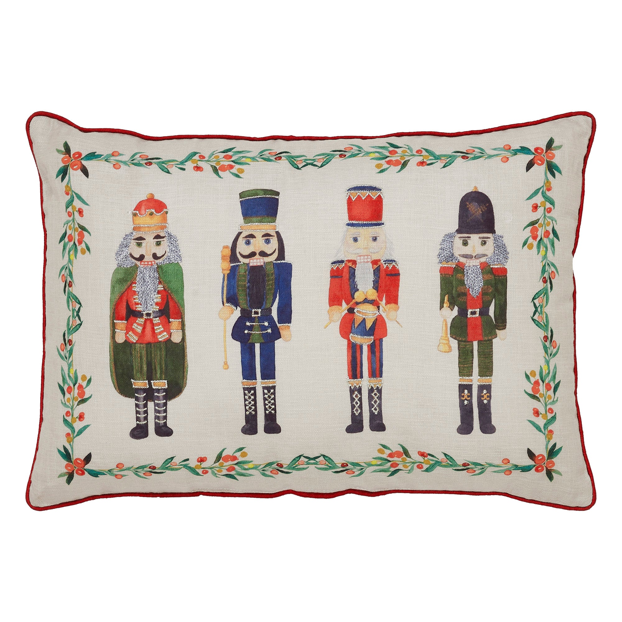 Size GuideAdd a festive touch to your home with the VHC Brands Traditional Nutcracker Pillow, a charming accent for your Christmas and winter decor. This decorative pillow features four classic nutcrackers standing proudly in colorful suits of green, red, and blue, each full of character and holiday spirit. Set against a warm dark creme polyester base, the vibrant print brings nostalgic joy and seasonal flair to any space. A printed border of evergreen branches and cheerful red Christmas berries frames the nutcrackers, giving the design a finished and festive look. Red piping around the edge adds a pop of contrast and enhances the traditional appeal. The pillow's rectangular shape makes it versatile for styling on sofas, armchairs, or beds throughout your home. Perfect for the living room, bedroom, or entryway, this pillow complements rustic and primitive holiday themes with ease. Made from soft cotton and spot clean only, it combines comfort with seasonal style. Whether you're hosting guests or simply enjoying a cozy night in, this pillow helps set the scene for a joyful Christmas atmosphere.