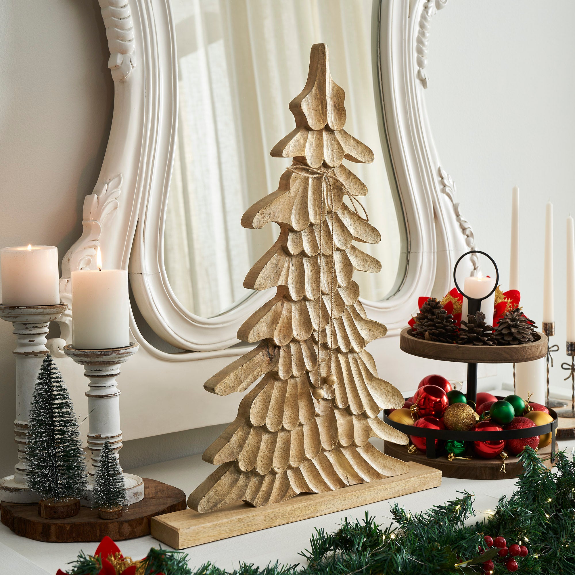 Size GuideMake a bold and elegant statement in your seasonal decor with the VHC Brands Winter Wonder Brushed Wooden Tree. Standing at 18x25 inches, this large decorative figurine features a beautifully sculpted tree with layered boughs that create a sense of movement and depth. Crafted from tropical wood and finished in a light wood tan with subtle touches of brushed gold, it brings a soft, shimmering glow that captures the warmth of the winter season. The tree is securely mounted on a matching wood base and accented with a twine tie and wooden beads, adding to its handcrafted, country-inspired appeal. The brushed gold detailing provides a vintage elegance, while the natural wood tones offer versatility for rustic, farmhouse, or traditional winter themes. Its eye-catching size and refined design make it ideal as a centerpiece for mantels, console tables, or festive displays. Perfect for enhancing any room-bathroom, bedroom, dining room, entryway, kitchen, or living room-the Winter Wonder Brushed Wooden Tree brings timeless beauty and a handcrafted touch to your winter decor. Durable and easy to care for, simply wipe clean with a soft cloth to maintain its charm. This stunning piece will become a treasured part of your holiday collection year after year.